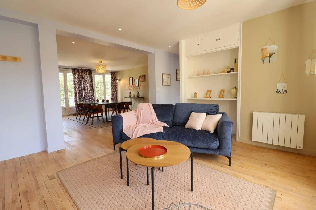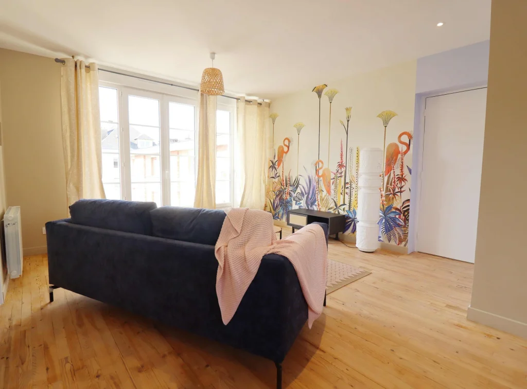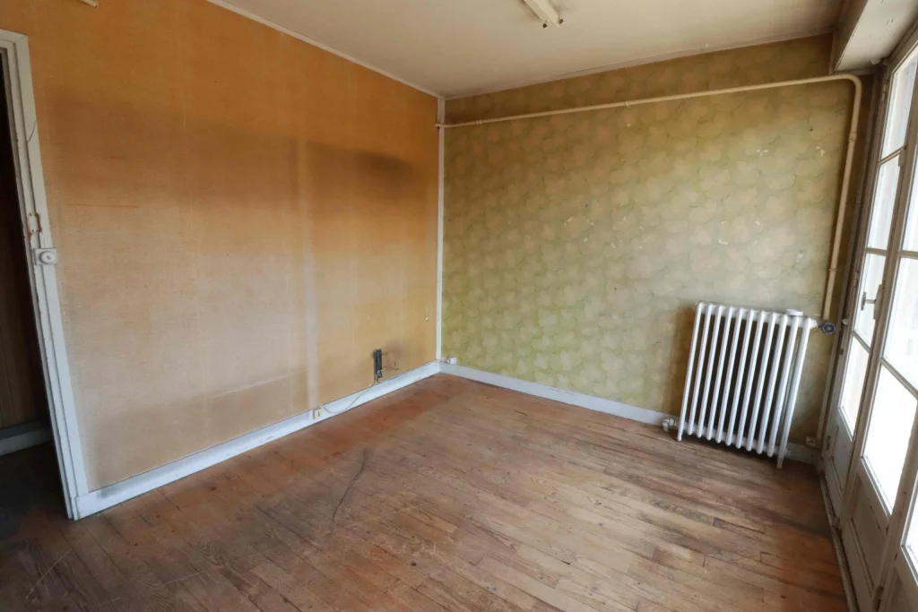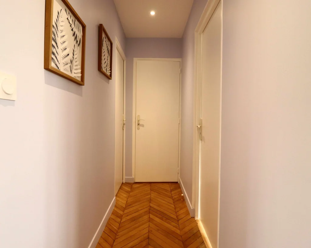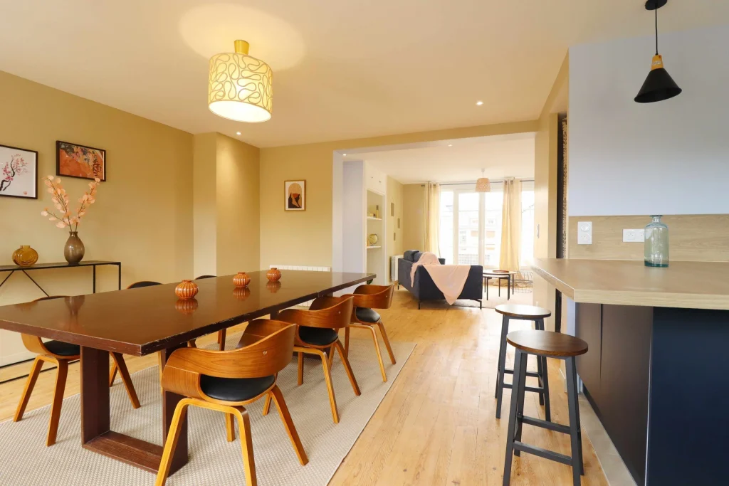 Malgré son état très abîmé, nous avons fait le choix de restaurer le parquet d’origine afin de préserver l’authenticité et le charme de l’appartement. En parallèle, la démolition de deux cloisons nous a permis de créer une grande pièce de vie ouverte, bénéficiant désormais d’une lumière traversante. Cette transformation a complètement changé la perception de l’espace, en le rendant plus lumineux, plus spacieux et plus agréable à vivre.