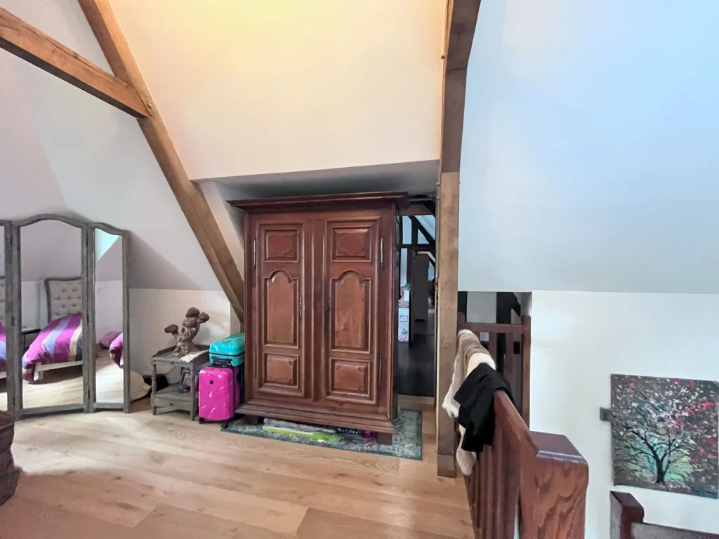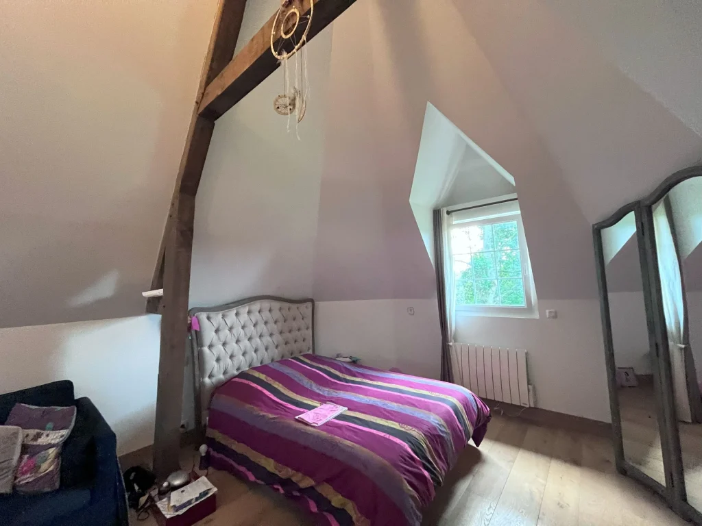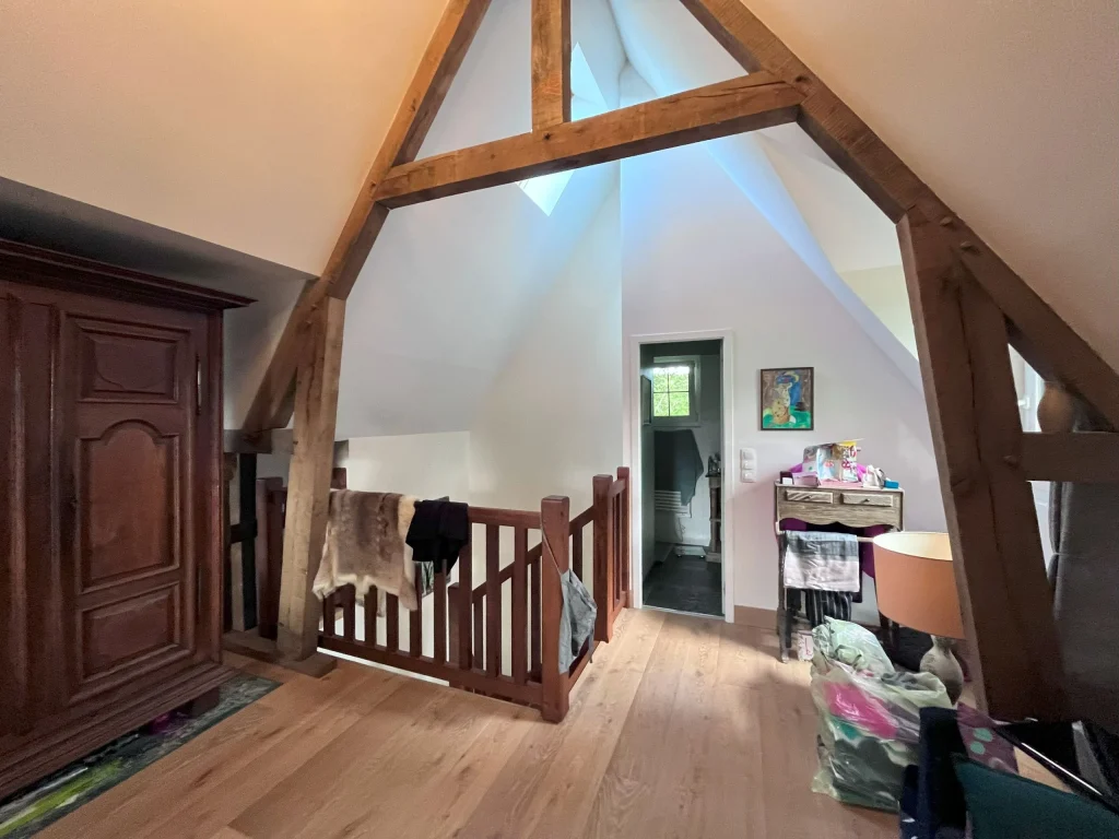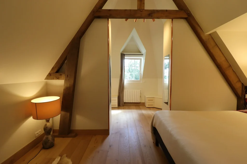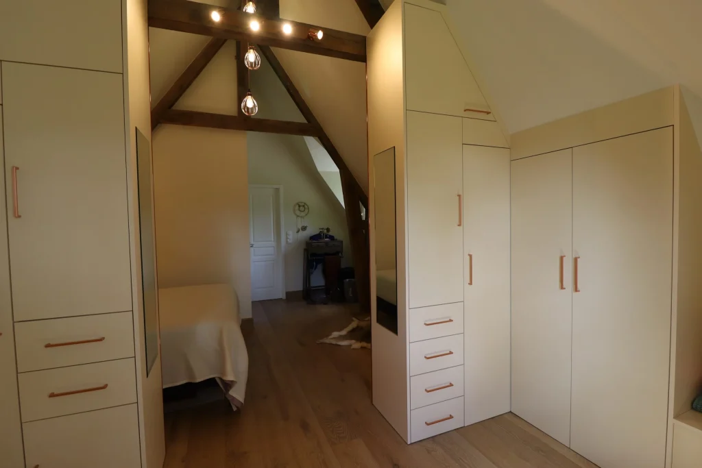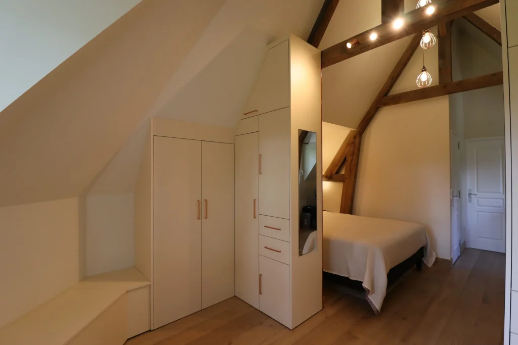Dans le cadre de ce projet d’architecture d’intérieur, nous avons transformé cette suite parentale, plus intime et fonctionnelle. L’objectif était de structurer l’espace et d’apporter davantage de confort, tout en optimisant les volumes existants sous la pente du toit. Nous avons conçu et réalisé un dressing sur mesure parfaitement intégré sous pente, permettant de maximiser les rangements. Cette nouvelle configuration offre une suite parentale harmonieuse, adaptée aux besoins du quotidien.