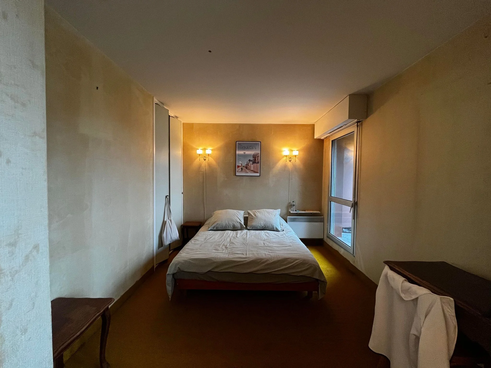 Le salon et la chambre n’étant pas séparés par une porte, il était essentiel de structurer les volumes sans fermer la perspective. Nous avons donc conçu un meuble TV sur mesure faisant office de claustra, permettant de délimiter les espaces tout en laissant passer la lumière naturelle.