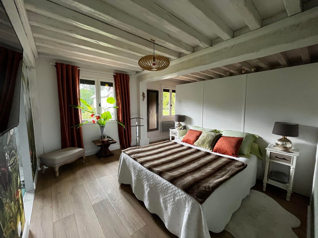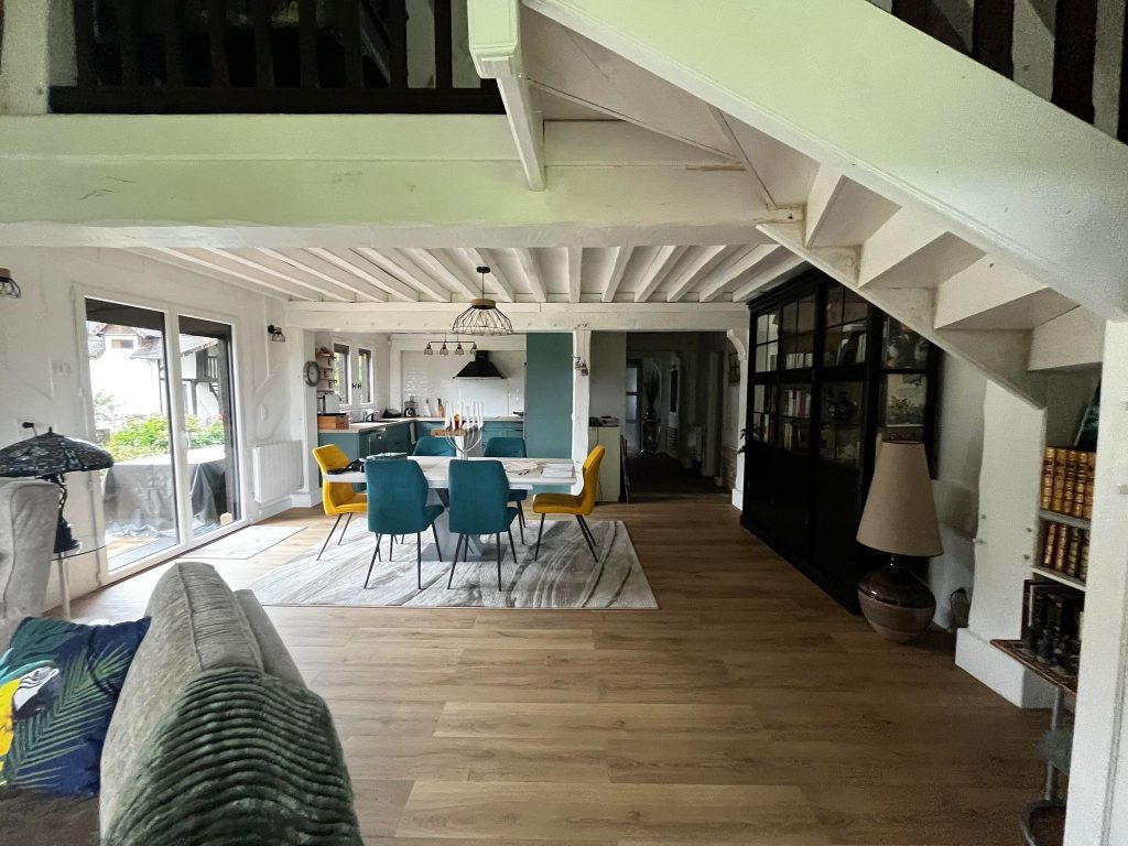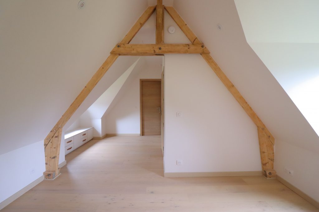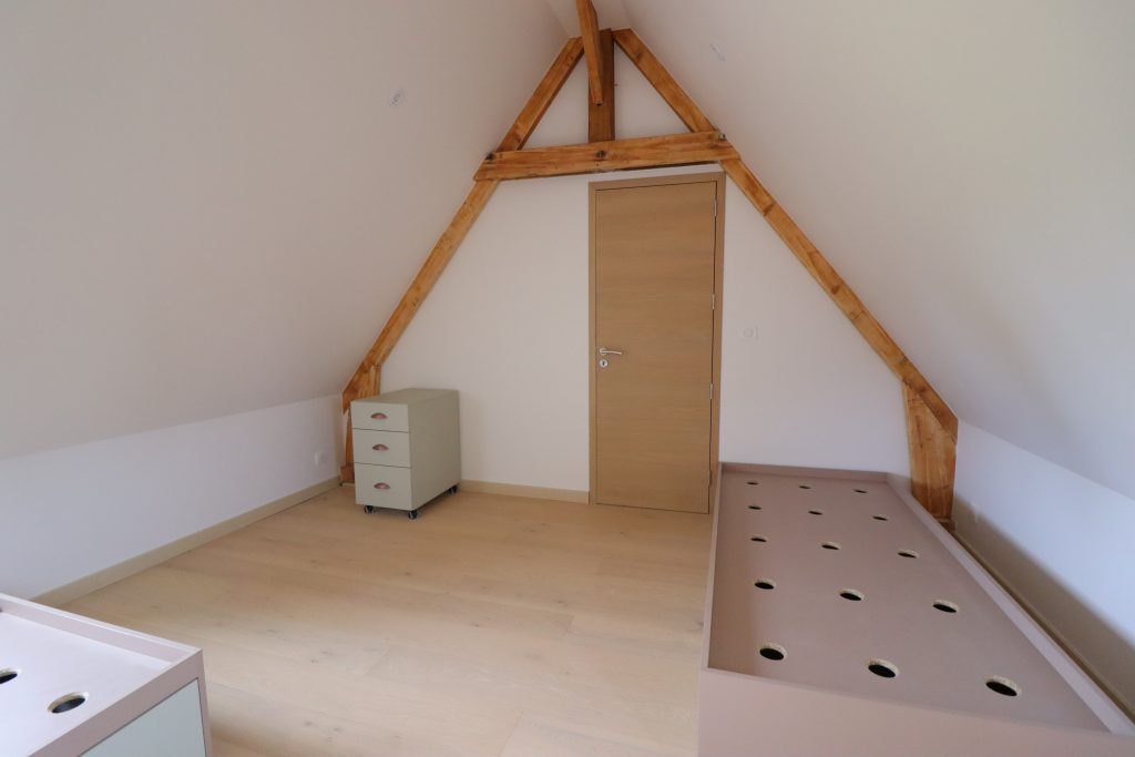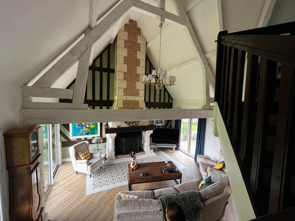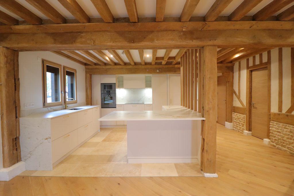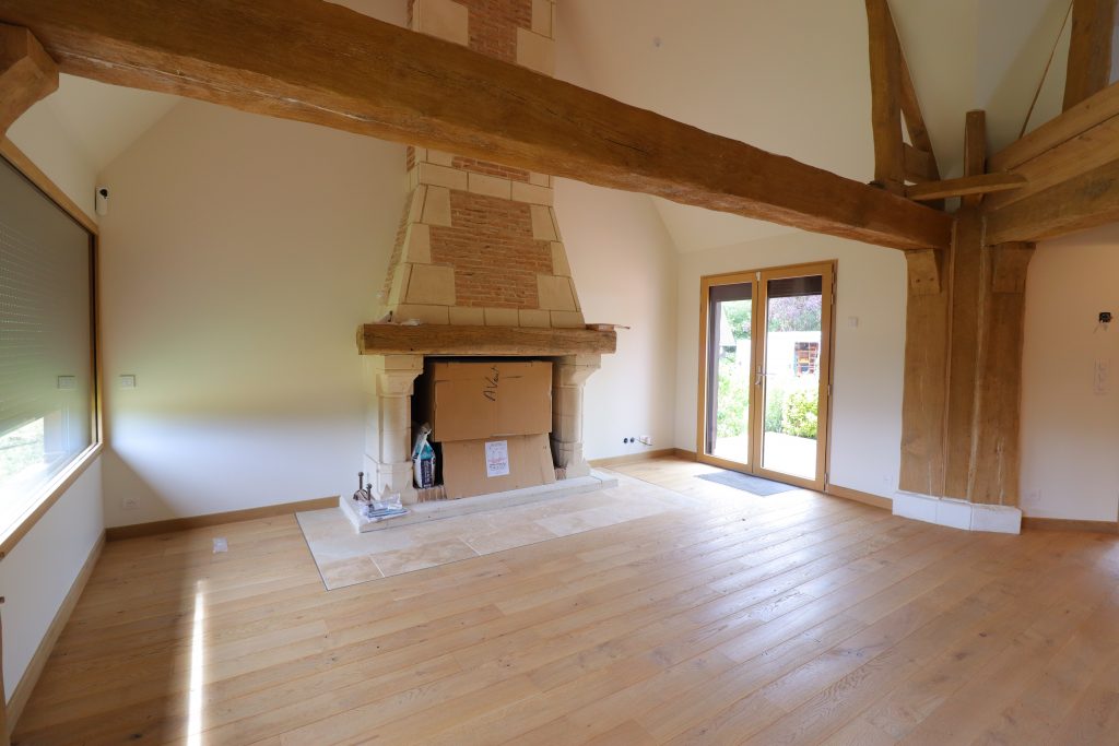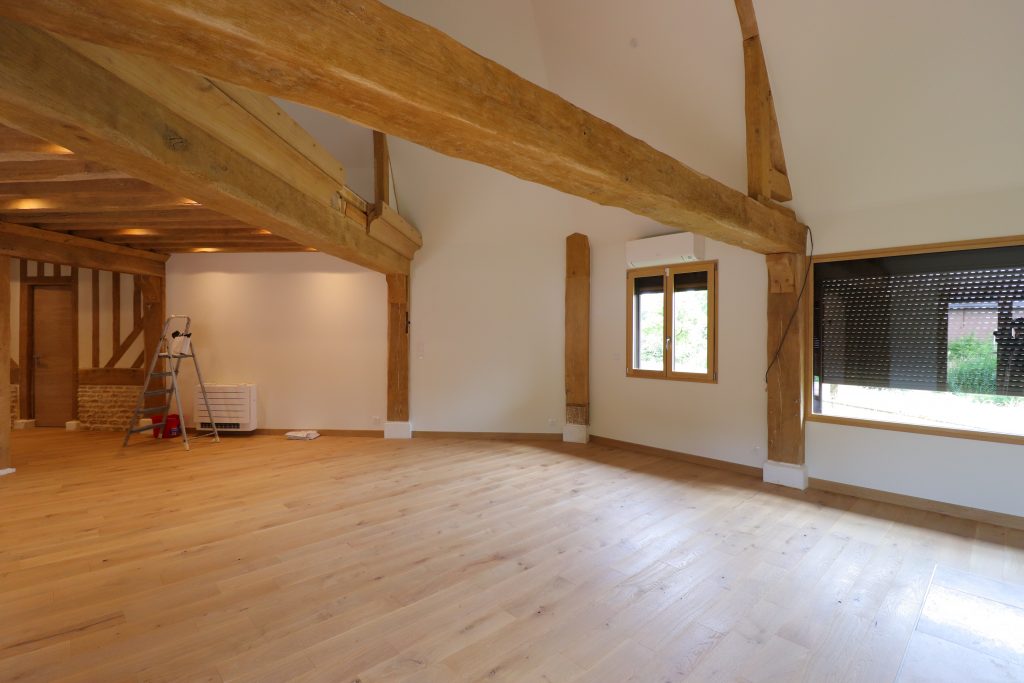À l’origine, l’ensemble des poutres avait été peint en blanc. Nous avons choisi de leur redonner toute leur authenticité en les sablant afin de retrouver la teinte naturelle du chêne. Un parquet en chêne a également été posé, et l’ensemble du projet a été pensé avec des matériaux nobles, en parfaite harmonie avec le caractère de cette maison normande.