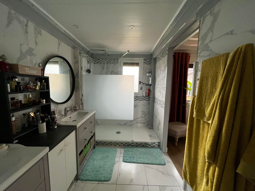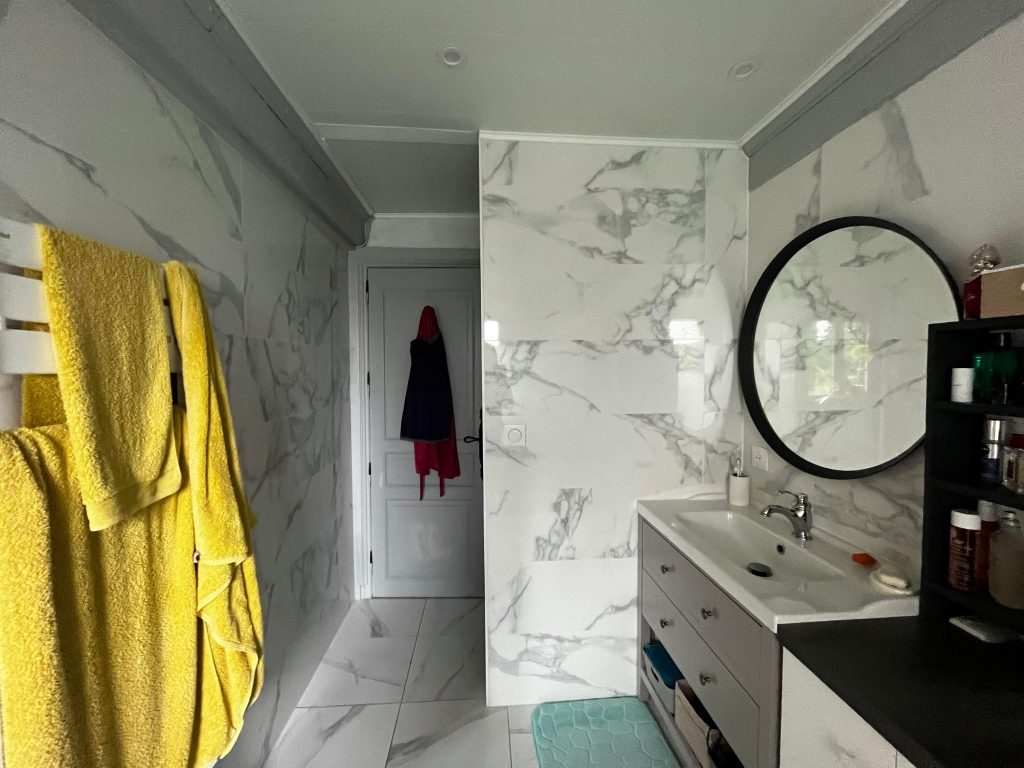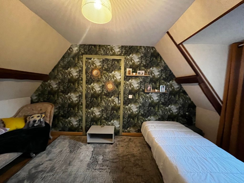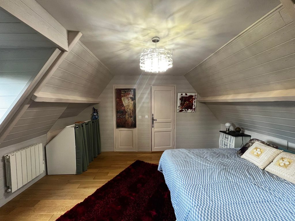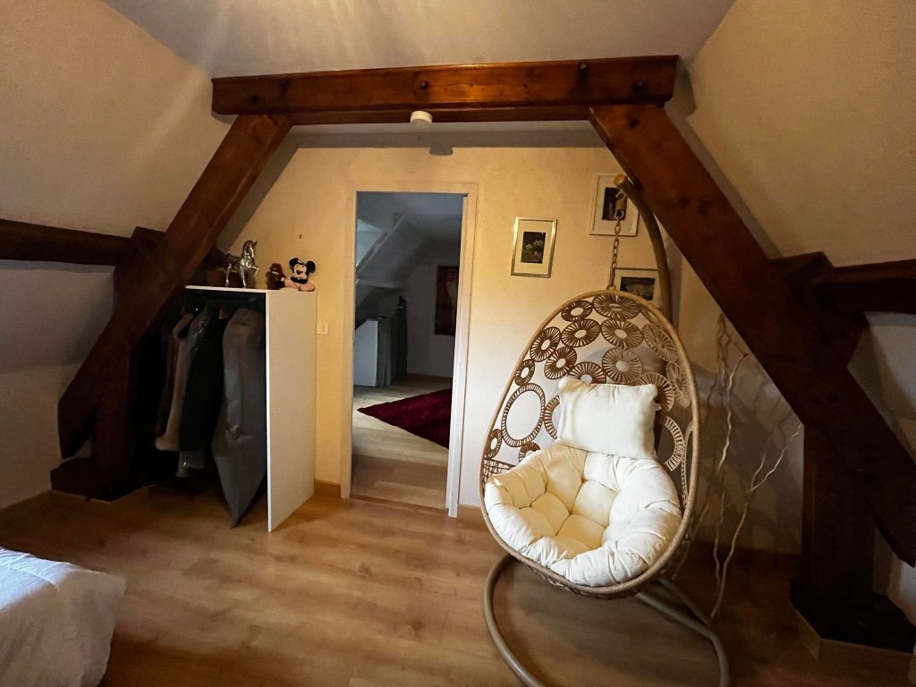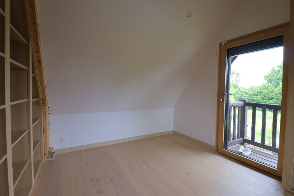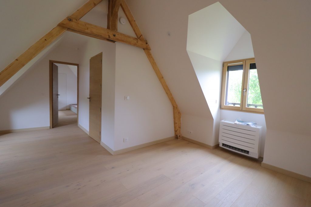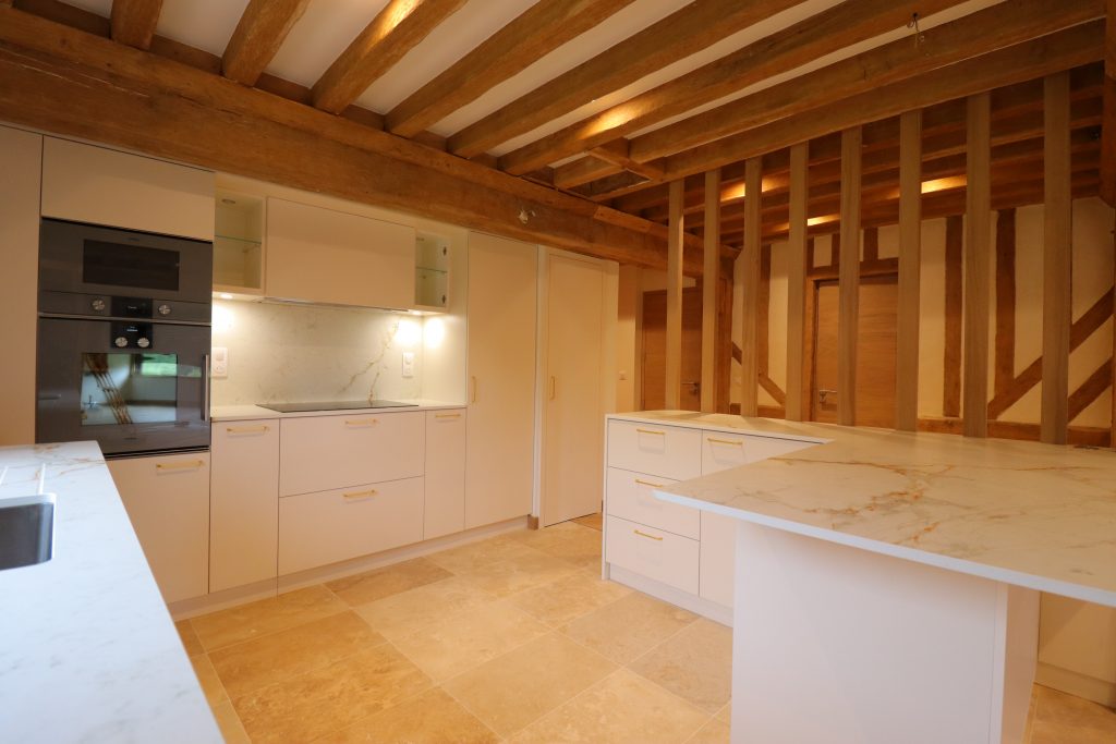 À l’origine, l’ensemble des poutres avait été peint en blanc. Nous avons choisi de leur redonner toute leur authenticité en les sablant afin de retrouver la teinte naturelle du chêne. Un parquet en chêne a également été posé, et l’ensemble du projet a été pensé avec des matériaux nobles, en parfaite harmonie avec le caractère de cette maison normande.