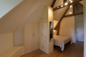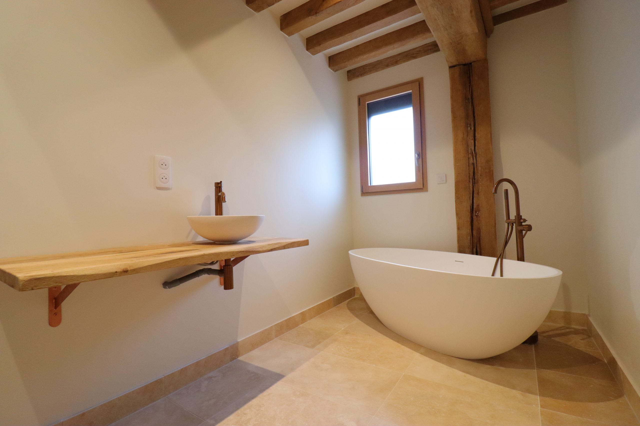 À l’origine, l’ensemble des poutres avait été peint en blanc. Nous avons choisi de leur redonner toute leur authenticité en les sablant afin de retrouver la teinte naturelle du chêne. Un parquet en chêne a également été posé, et l’ensemble du projet a été pensé avec des matériaux nobles, en parfaite harmonie avec le caractère de cette maison normande.
